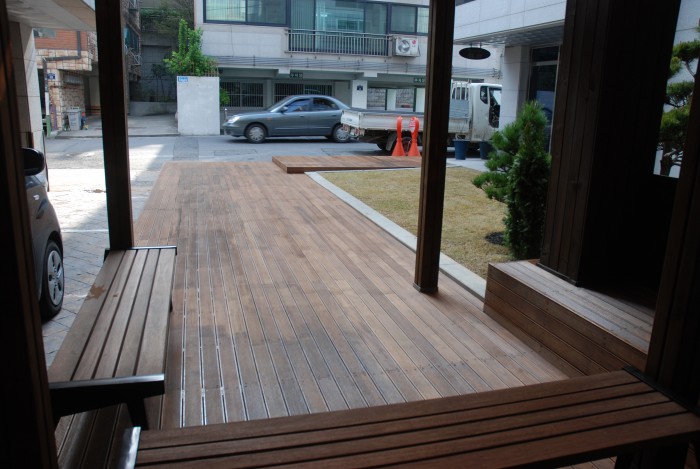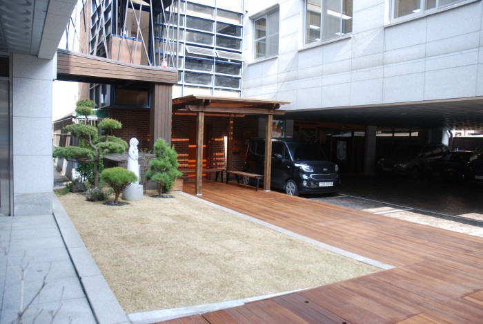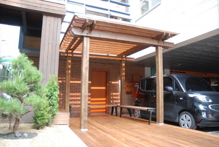 현관 중정에 설치된 데크, 파고라 사이즈 3,000*3,000 이며