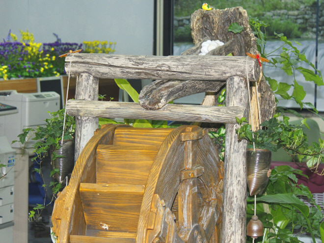 사무실 안에 물레방아를 이용하여 수공간을 연출