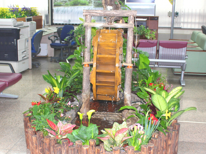 실내조경 사무실 안에 물레방아를 이용하여 수공간을 연출