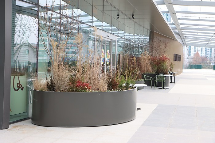 수원스타필드 2층 실외공간에 설치된 곡선철제플랜트박스입니다.