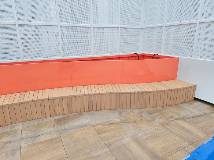 목재벤치 또한 내부 아연각관으로 틀을 제작하여 분체도장 마감하였고