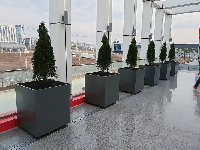 자동관수로 제작된 철제플랜트박스에 에메랄드 그린 식재된 사례입니다.