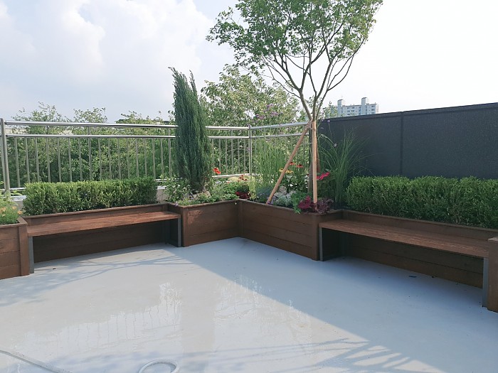 방부목플랜트박스를 두고 가운데 하드우드벤치로 휴식공간을 조성하였습니다.