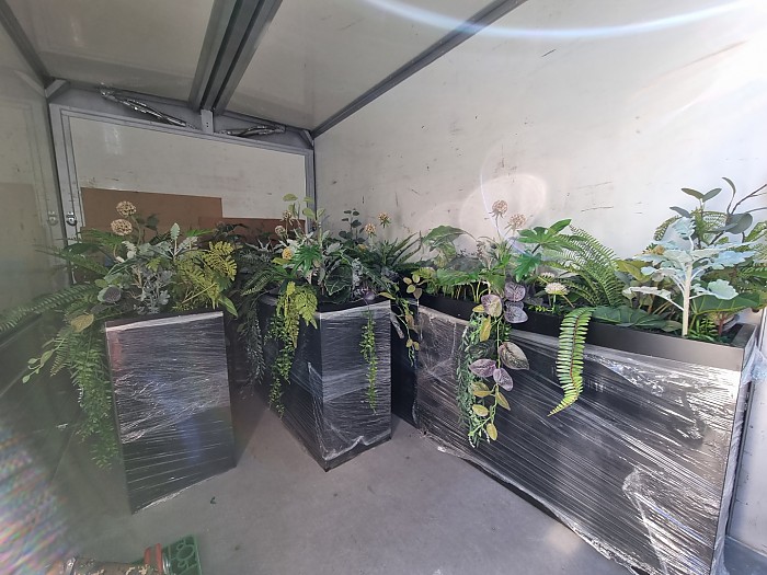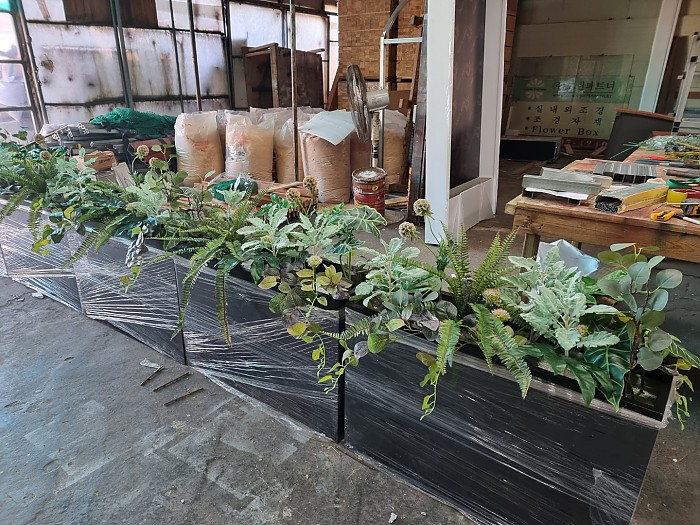 철제플랜트박스에 조화를 식재한 사진입니다.