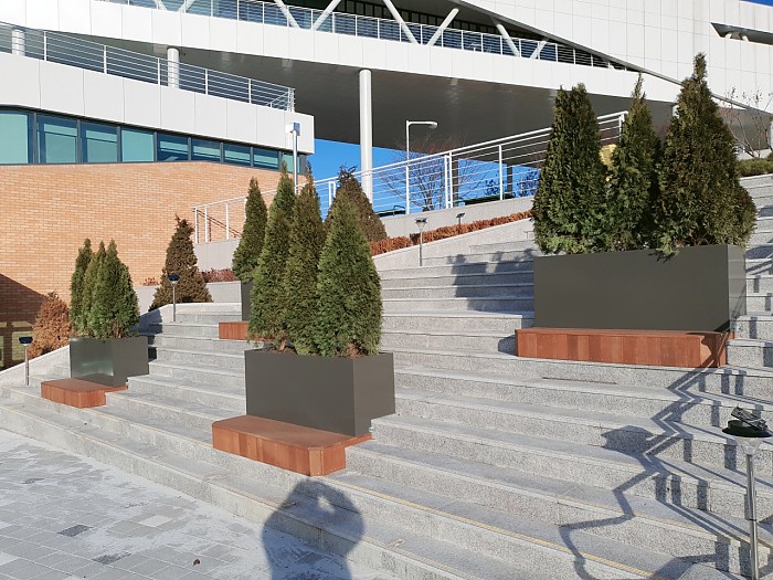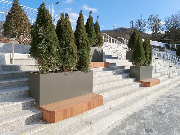 계단에 철제플랜트와 목재벤치를 조합해 벤치형 플랜트를 제작
