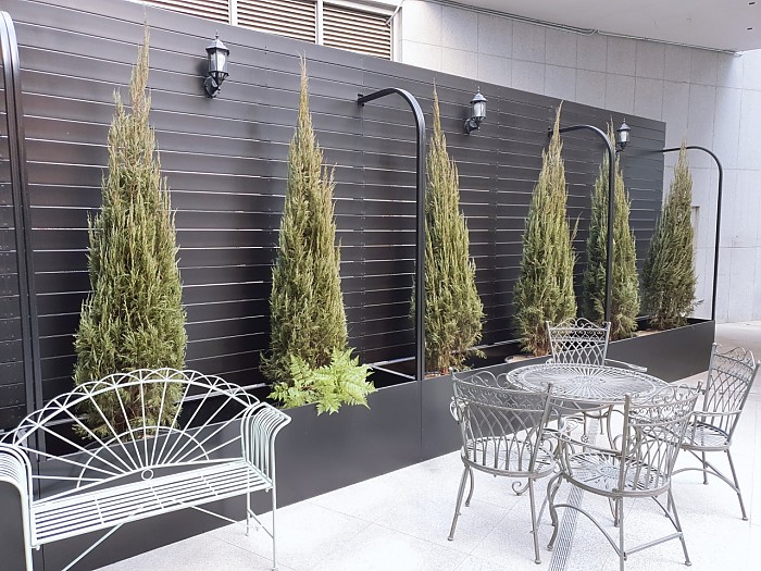 높은 담장 느낌의 휀스를 설치, 휀스 앞쪽으로 플랜트박스를 배치해