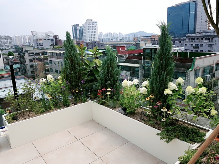 다양한 사이즈의 아이보리 철제플랜트박스를 곳곳 배치해 식물을 식재하여