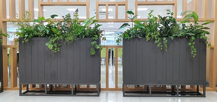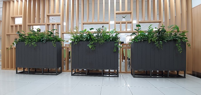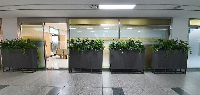 방부목으로 제작된 플랜트박스에 하단에는 분체도장한 철제프레임을 두었어요