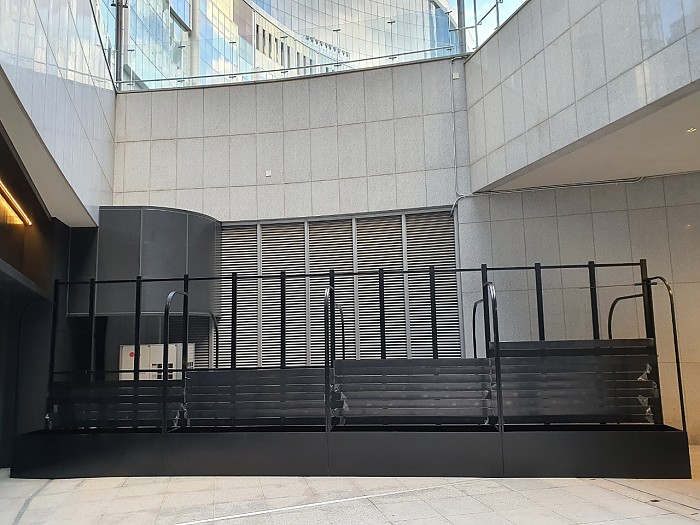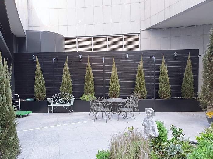 높은 담장 느낌의 휀스를 설치, 휀스 앞쪽으로 플랜트박스를 배치해