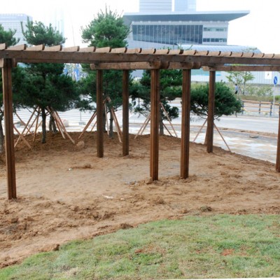 시흥에 설치된 복층렉산 목재파고라입니다. 2500*4000*H2700 방부목으로 제작된 목재파고라입니다. 오일스테인 마감된 목재로 ..