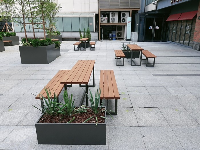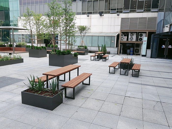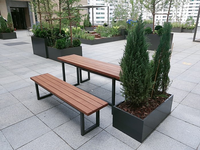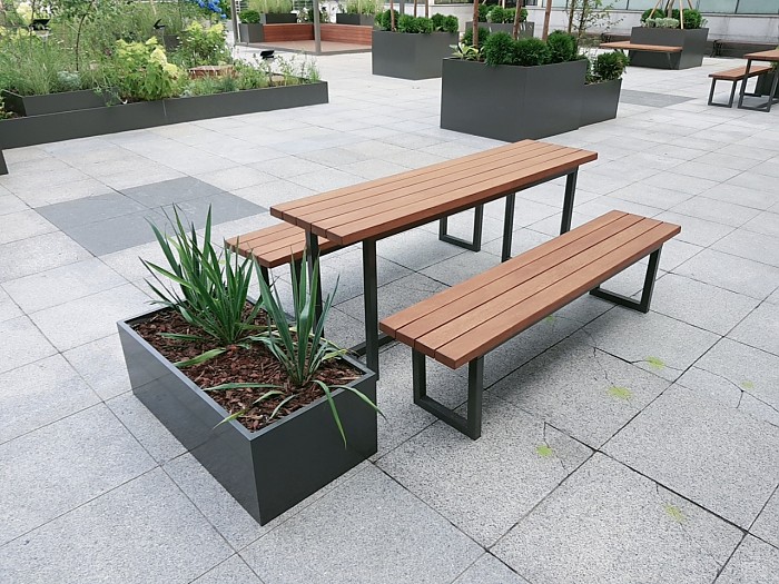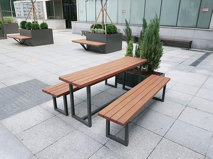 심플한 디자인의 야외용 테이블/벤치 세트입니다.