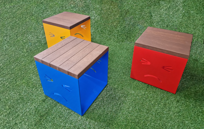 깜찍한 표정의 철제프레임에 하드우드 목재로 만든 벤치입니다.
