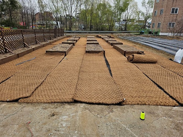 레티스텃밭상자, 텃밭상자, 야자매트로 텃밭을 조성하였습니다.