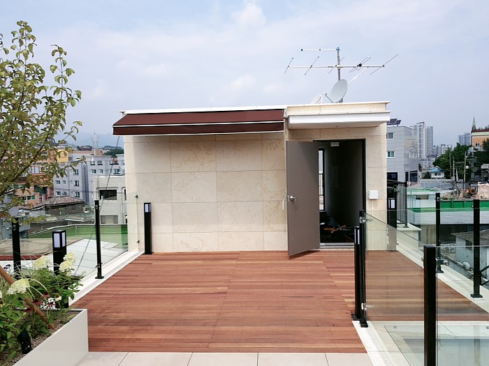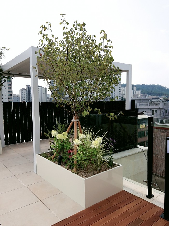 옥상조경-실외 데크, 합성목휀스, 철제플랜트를 이용한 옥상조경