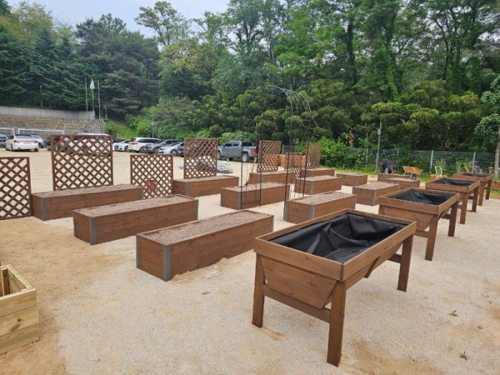 알루미늄코너 방부목화분, 트렐리스 휀스, 높은 텃밭상자로 조성된 현장입니다.