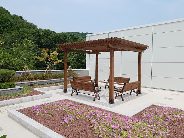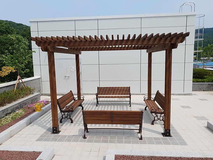 편안한 휴식공간 되시라고 넓은 파고라 아래 주물벤치를 두었습니다.