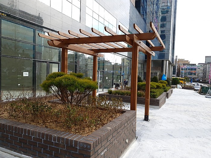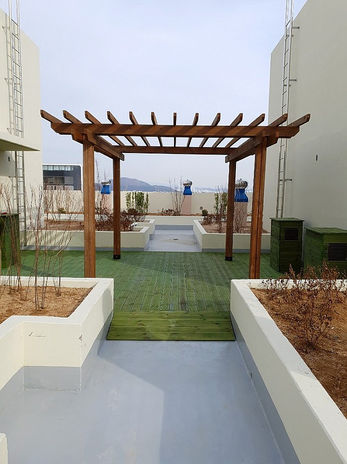 인천에 의차한 사옥 옥상과 휴게공간에 파고라 및 데크 설치 사진입니다.