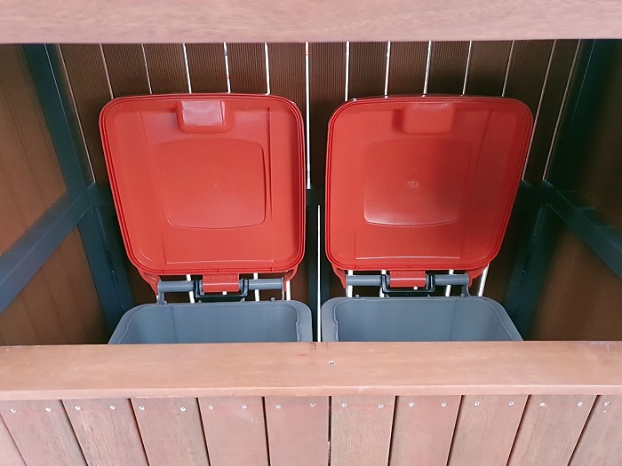 분체도장한 철제프레임에 하드우드 목재를 붙여 제작된 쓰레기 수거함입니다.