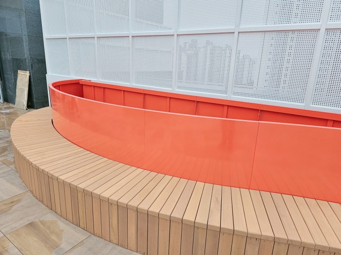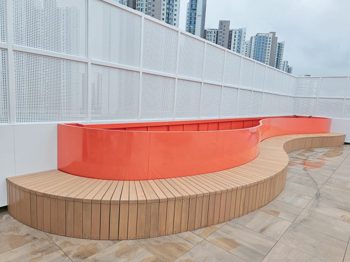 목재벤치 또한 내부 아연각관으로 틀을 제작하여 분체도장 마감하였고